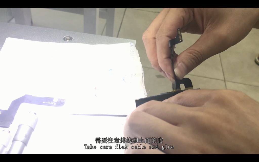 下面进行排线对位,首先是确认液晶摆放的位置,下面这个是排线对好的图,在位置对好后,使用棉签轻压排线,为了更好让排线和液晶粘在一起,做好以上的动作后,移动镜头检查排线线路,确认所有的排线都是对好的。