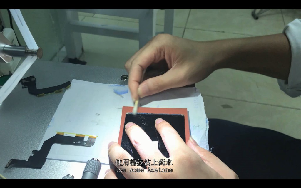 旧的排线拆下后,用到的工具包括:棉签、丙酮药水。首先用棉签沾一点药水,均匀涂在排线位置,等待药水腐蚀一会,再次使用棉签。慢慢地将上面残留的胶清除,在清除残胶时,注意棉签清除残胶的力度,屏幕玻璃相对薄,清胶的力度需要柔和和均匀。