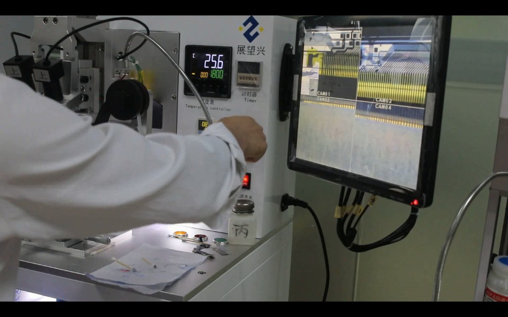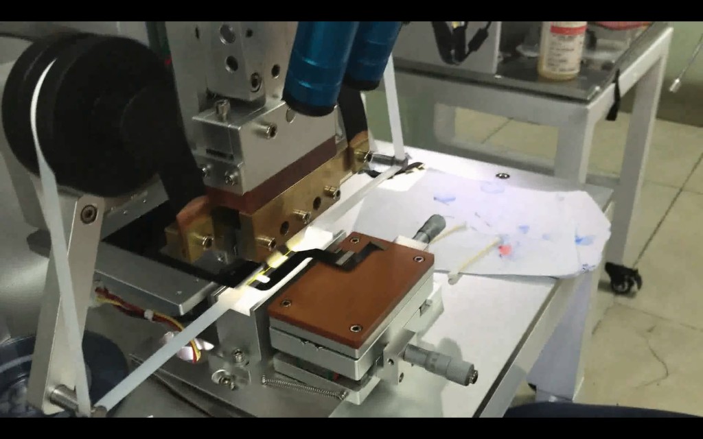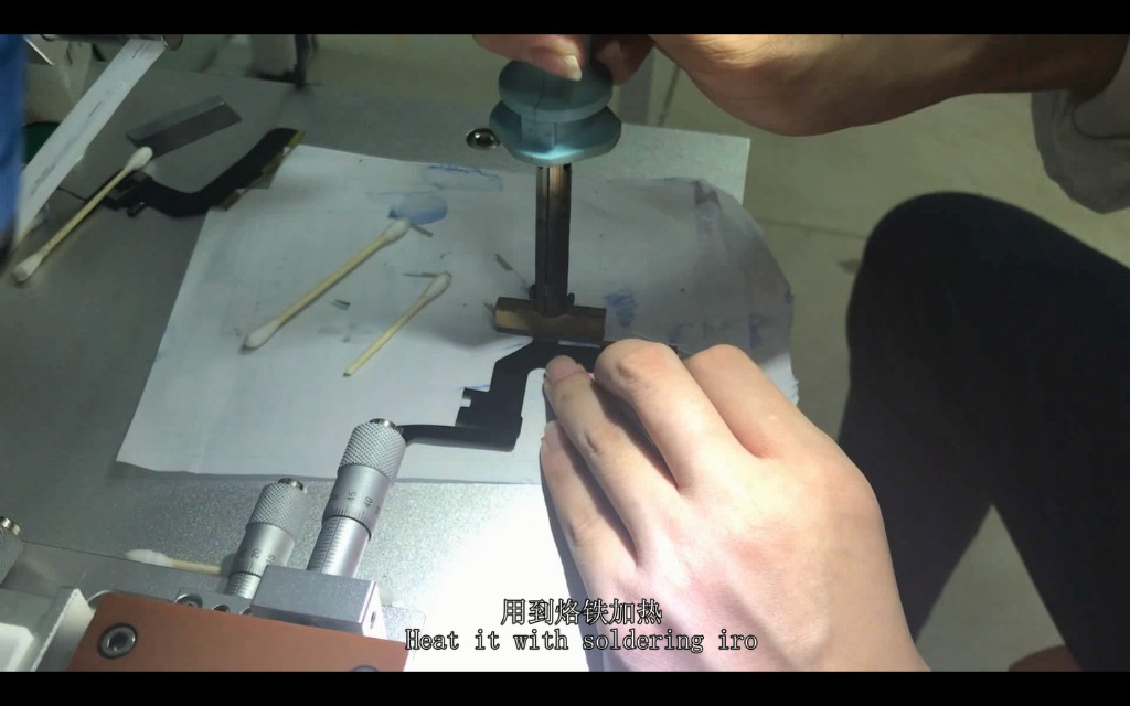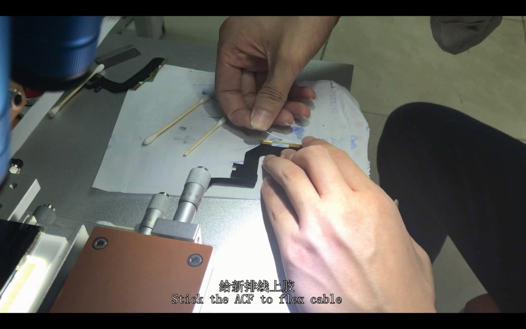 清完胶后,需要给新的排线重新上ACF胶,剪下比排线长一点的ACF胶,然后对准排线上面的线路覆盖上去,这个时候要注意手不可以碰到要压合的胶,只能拿边缘的胶或者用镊子上胶。然后使用电烙铁加热,加热时间5-8S,这一步是为了方便ACF胶充分粘在排线上。