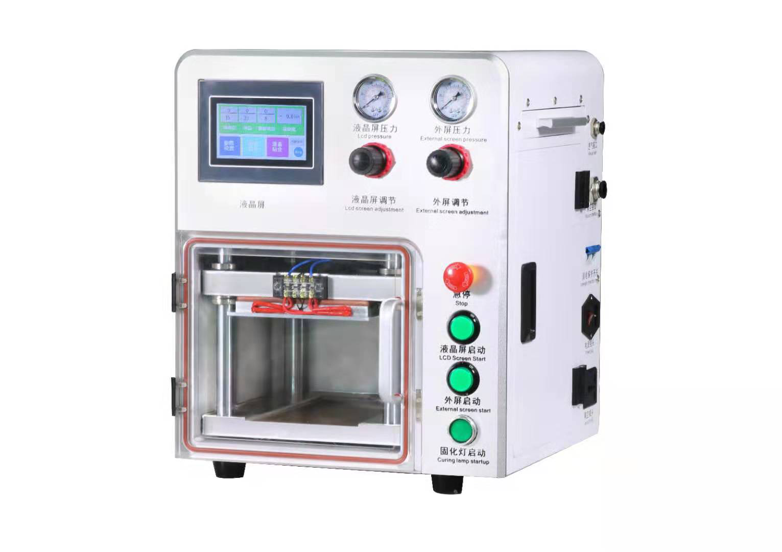 更值得一提的是,如遇上OCA胶贴合后出现错误需重新贴合的情况,新款曲面贴合机在顶部新增的加热台就起到了很好的辅助作用,同时可辅助液晶或者盖板加热除胶;此外,机器的侧面新增了蓝光UV灯照射已贴合好的屏幕,可防止OCA反泡,大大提高了压屏良率。