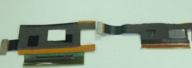 上面两条排线是从不同的两条屏幕上面拆下来的,我们看右边的黄排凭借肉眼是可以看到一条条的线路,而左边绿排的线路更加密集,肉眼几乎无法识别,清洗时也更加容易把线路洗掉了。