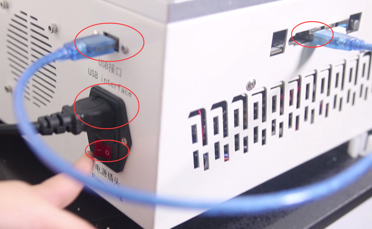 首先把机器背后两个接口接上线,1)电源线插上通电;2)把配送的USB线两端与机器连接上,另外在机器侧面插上的就是一个无线鼠标跟键盘的无限网口,完成后把电源开关打开,接着回到机器前面依次启动电脑、排烟、电源三个功能键即可。