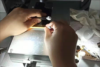 清理干净后,使用高倍镜头检查线路是否干净,随后进行贴胶、对位、下压。