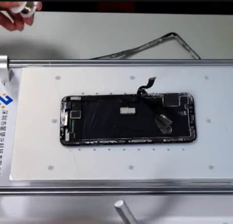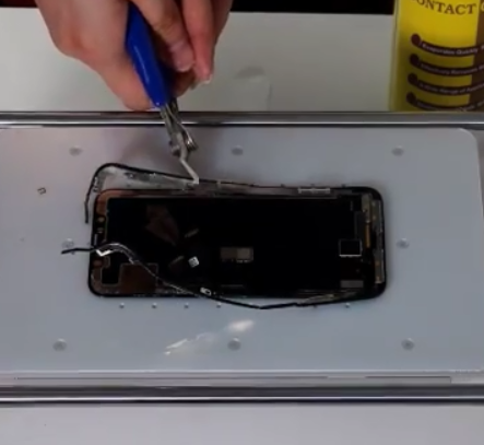 仍以ipone X为例,为避免阻碍钢丝分离,屏幕在分离前要将听筒的铁片拆下,同时需要注意钢丝进线位置,以避免分离到触摸层,此外,分离到排线位置需要注意排线。
