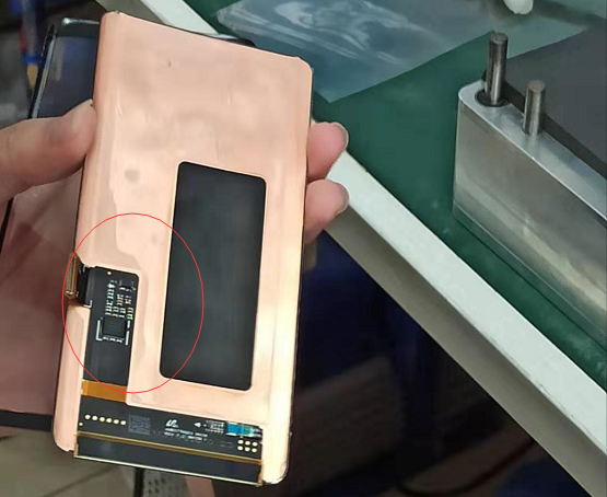 下面再来说说贴合内屏,使用黑色垫子,主要是为了保护下图中的位置。那么,内屏与盖板贴合的位置是如何的呢?内屏要贴在听筒的下边,盖住OCA胶即可,贴合后也是要尽快压屏,不然容易起泡。