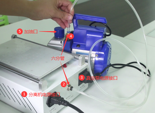 第一、分离机的安装。首先依次把分离机电源、六分管、真空泵电源、真空泵管接上,接着把主电源(分离机为主电源)接到排插上。其中,真空泵的电源插在分离机上;此外,图中5为倒油口,加油时往这里面加即可。
