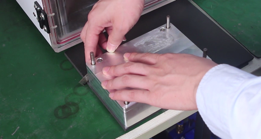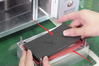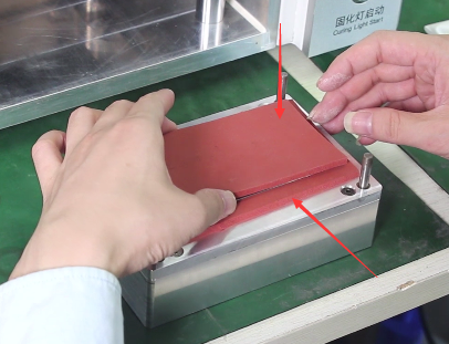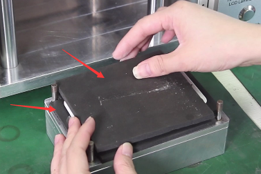 然后就是放垫子环节,在模具底座放上黑色垫子后再把屏幕放上,接着在屏幕上方还需再放一个与下边一样大小的黑色垫子,完成即可点击液晶屏贴合按键启动