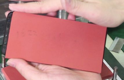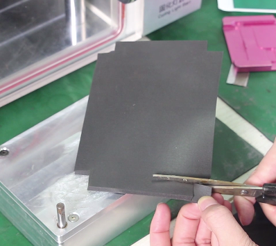 除了参数设置对贴合屏幕十分重要外,垫子裁剪是否正确也尤为关键,那要如何裁剪垫子呢?首先把磨具底座放在黑色垫子上并四周对齐平整,接着使用刀片顺着模具边缘裁一块与磨具面大小一样的垫子,考虑到模具四个角有柱子,所以还需把裁好的垫子四个角去掉以便放下去时留有空间。