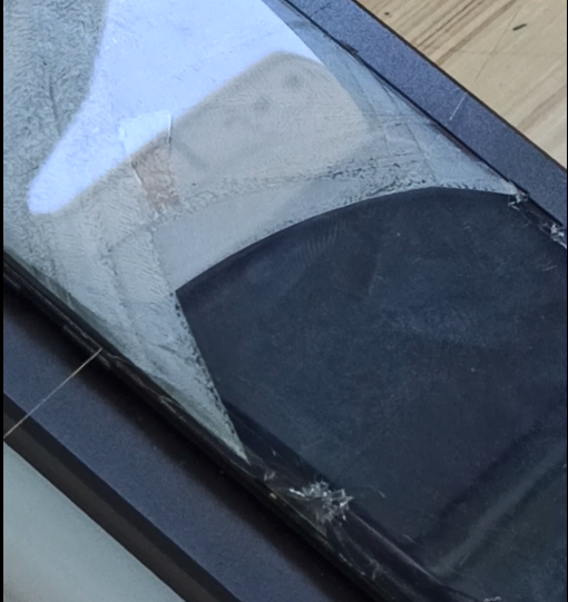屏幕分离就来压屏,1)先来压盖板,通过手工对位从两边挤压贴上OCA胶,接着把红色垫子置于盖板上方即可启动机器进行贴合后除泡;2)压液晶屏,同样无需模具对位,不同的是需要把红色垫子换成黑色垫子,随后启动机器进行贴合并除泡即可。
