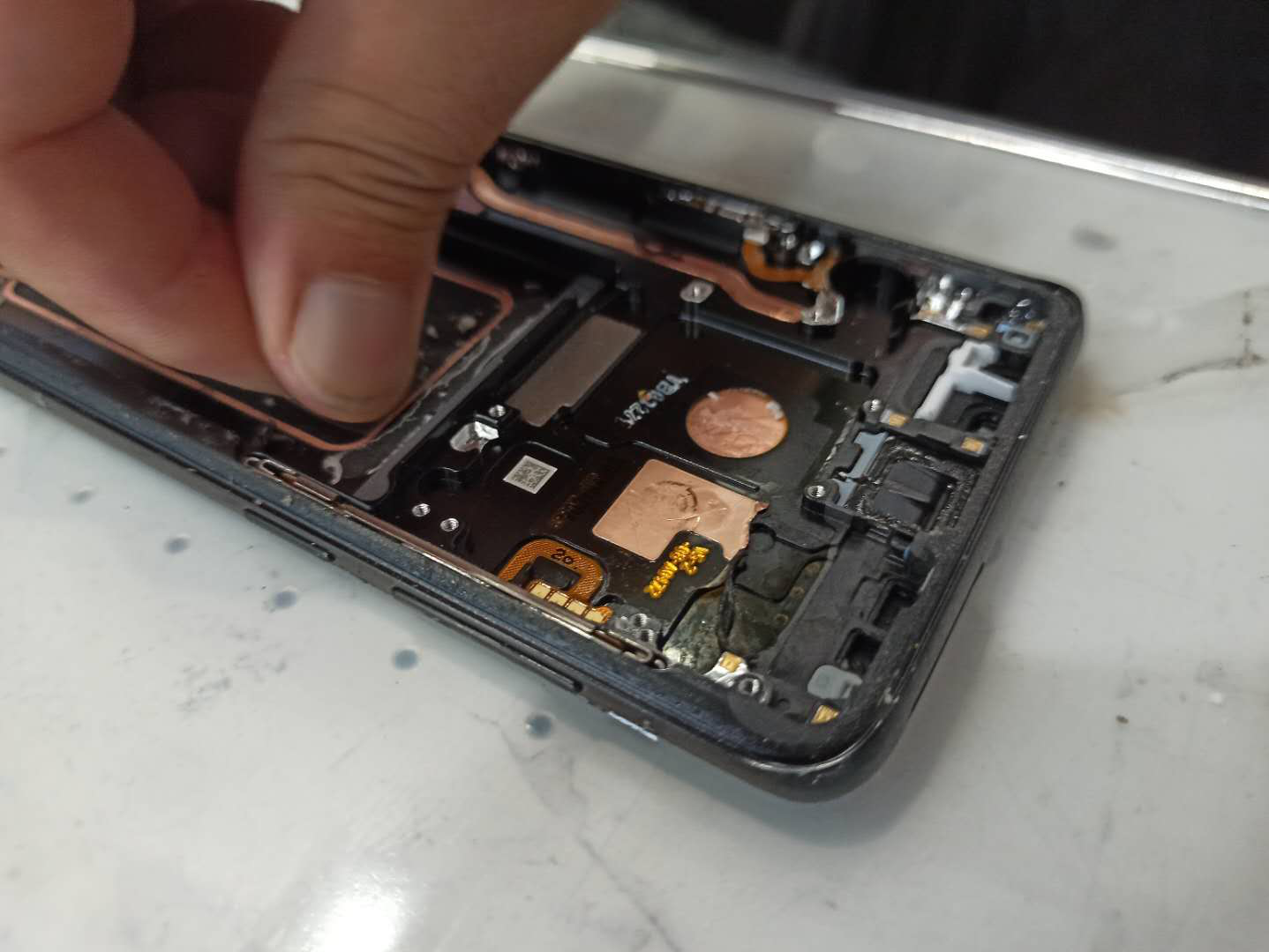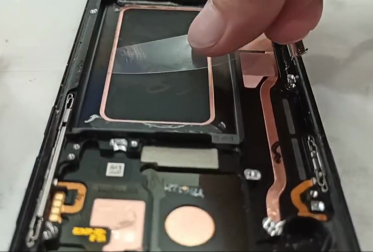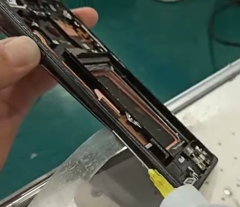 中框拆下后就是分离盖板的环节,建议分离前先把边框的胶清理干净,不然钢丝进线受阻且容易把杂物卷进内屏造成损坏;此外,为方便进线,可使用薄卡片在屏幕边缘多开小口,在分离到曲面部位时,钢丝沿着屏幕边缘慢慢走线即可成功分离。