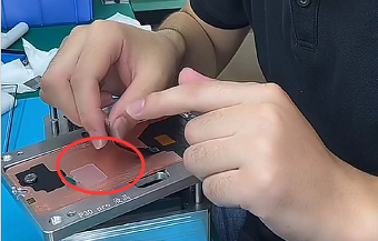 但是需要注意一点,由于液晶屏幕上的排线ic比较厚,所以在把屏幕按下底座硅胶前需要垫一张拆机片于排线ic位置上。