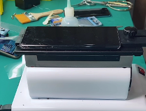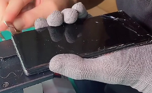 钢丝分离完后直接上酒精使用OCA薄片将屏幕划开,但是由于钢丝分离到底部转弯部位就没有进行分离了,所以当分离到底部时需要用刀片刮开底部黑胶,然后翻开屏幕取下来再加热屏幕处理边框残胶,只需曲面分离机加热至110度并点上酒精撕下即可。