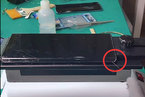 首先提前处理顶部边胶再进线分离。处理边胶的方法是把屏幕置于曲面分离机上进行加热,然后点上酒精(纯度99.7)使用OCA薄片在屏幕顶部穿插过,而为了方便OCA薄片能穿插出来,建议使用刀片或薄片在屏幕上轻轻划开一下,OCA薄片穿插出来后沿着边框将顶部划开即可。