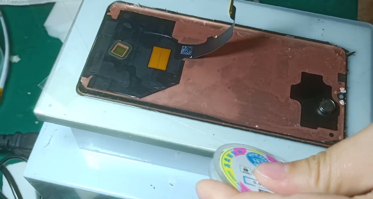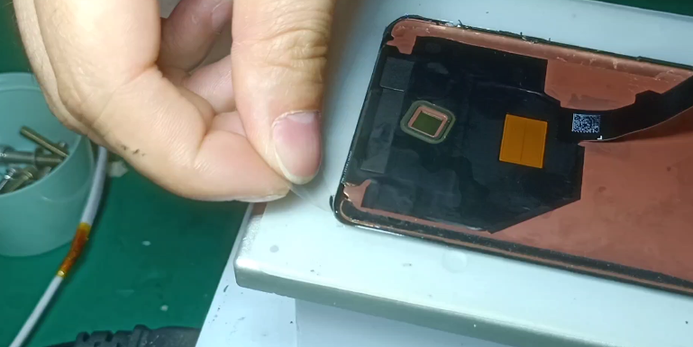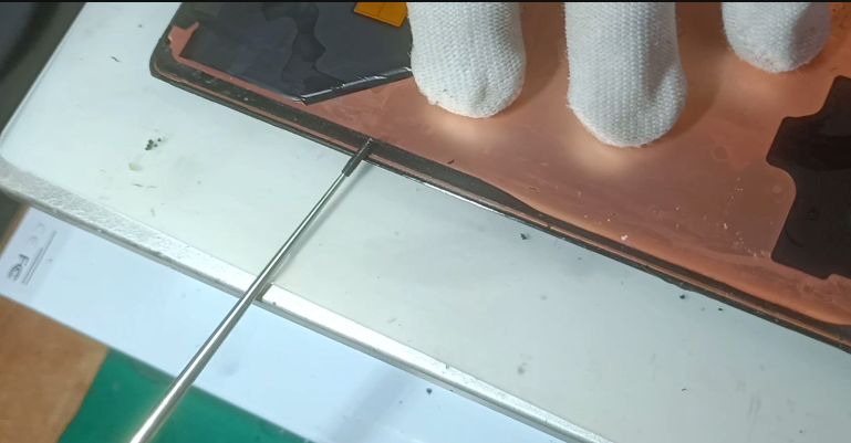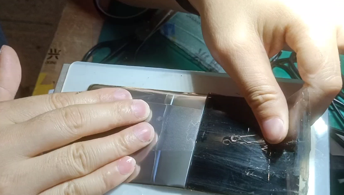 薄片开出一个小口后,钢丝顺着薄片开始进线,这时拉钢丝的手法很重要,稍不注意就会分到偏光,等钢丝把盖板分离一半后再出线从另一边进线分离,分离下来的屏幕要做一个保护贴,主要是为了避免扣子给屏幕增加压力。