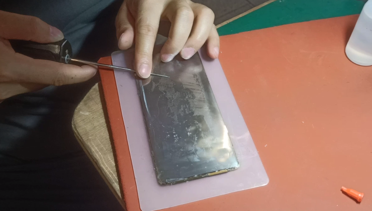 为避免钢丝进线受阻,先将屏幕四周的黑胶以及背面的残胶全部清理掉,如果玻璃盖板非常破碎,建议在玻璃盖板表面贴上一层胶布。