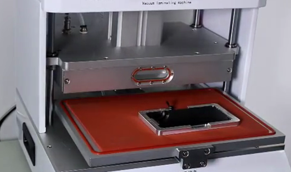 接下来就是压屏,我们在放上盖板后千万不能用手压,在屏幕上乱按,以免进了空气而后面的时候除不了,盖上盖板轻轻点一下中间后,就放进贴合机里进行压屏就可以了,注意压力0.2MPa 贴合机的温控也要打开,让贴合机加热至40度左右,贴合时间在10-15秒即可,真空可以适当的保持5-8秒。