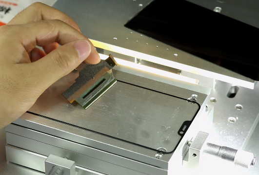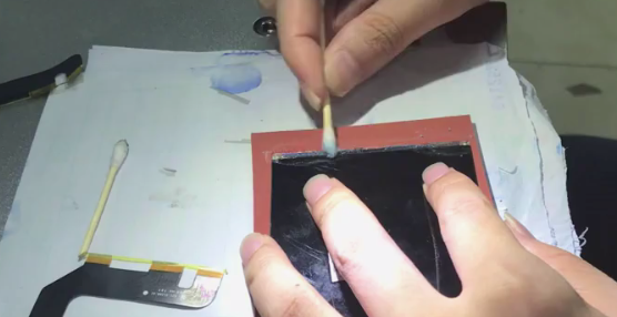 首先要拆除屏幕总成及背光,通过加热或烙铁加热撕排线(加热台120度、烙铁30W),接着使用丙酮清理排线上的残胶,需要小心清理以避免造成损坏,紧接着为排线贴上ACF胶后,液晶对准刀头位置试压刀头跟液晶的吻合度,并利用镜头对位液晶与排线。