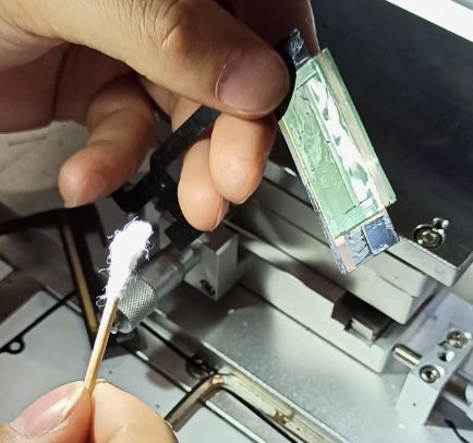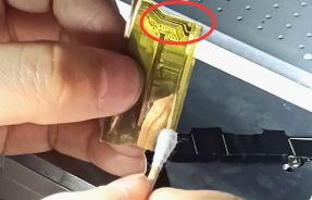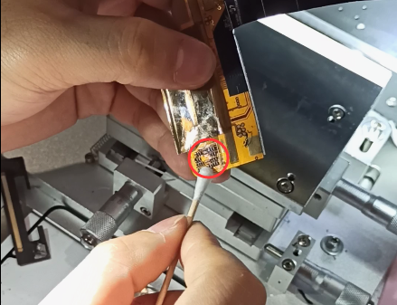 压排机的显微镜可以观察到该部位呈现黑色发霉,线路清洗后必然会断开,这时通过飞线将线路连接起来再用