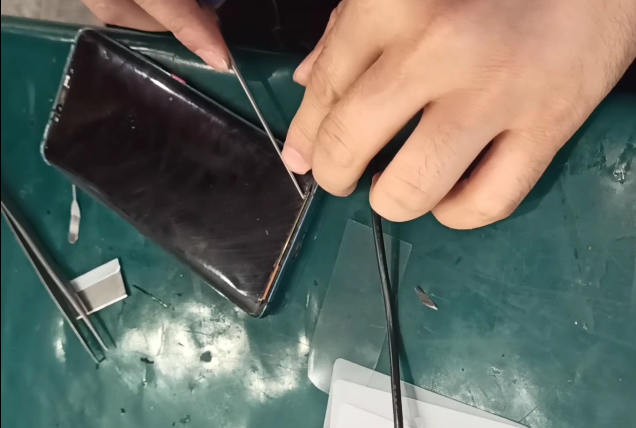 分离盖板的前提是,屏幕必须要充足加热才能达到顺畅分离的效果,此外,所使用的钢丝为0.035mm,钢丝进线后保持斜分,分离过程如遇钢丝被玻璃缺口割断且难走钢丝的情况,可借助刀片轻开个小口再进线,不过刀片不能伸太进,否则会损坏内屏。此外,分离过程要不断转换分离角度,如果两边同时分离会造成受力面积过大。