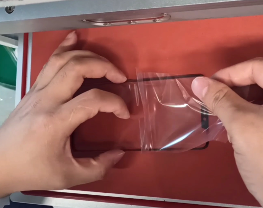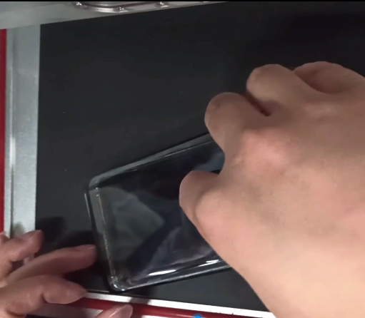 压屏机进行压屏,一般使用黑色垫子进行压屏,垫子大小与盖板一样大即可,需要注意的是,裁剪的垫子一定要精密才会达到无泡的效果,所以垫子不能过大或过小,如果过大两边弧度压不到会产生气泡,前后过长气泡还没出去就已经被封住成死泡。