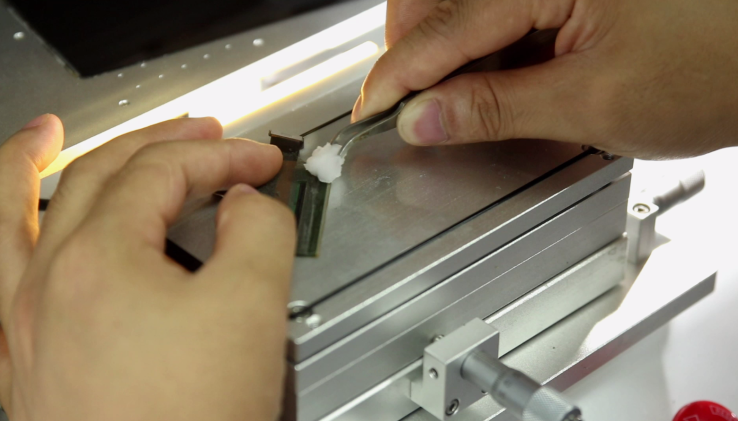 压排机的高倍镜头来看清线路,此外,屏幕放在压排机吸盘上时先用干净的棉签把石英条擦拭干净并用美纹胶黏住屏幕避免移位,具体操作可以联系我们喔!