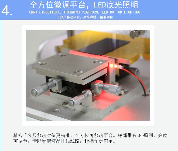 对位平台系统由很多精密零件和导轨以及千分尺构成,也是排线和液晶玻璃的置放平台,通过手动调整位置或电机自动调整位置,将液晶玻璃和排线的线路完美对接。一套好的对位系统对压排机来说至关重要,如果对位不够精准,压出来的屏幕不是不显示就是显示出线条。